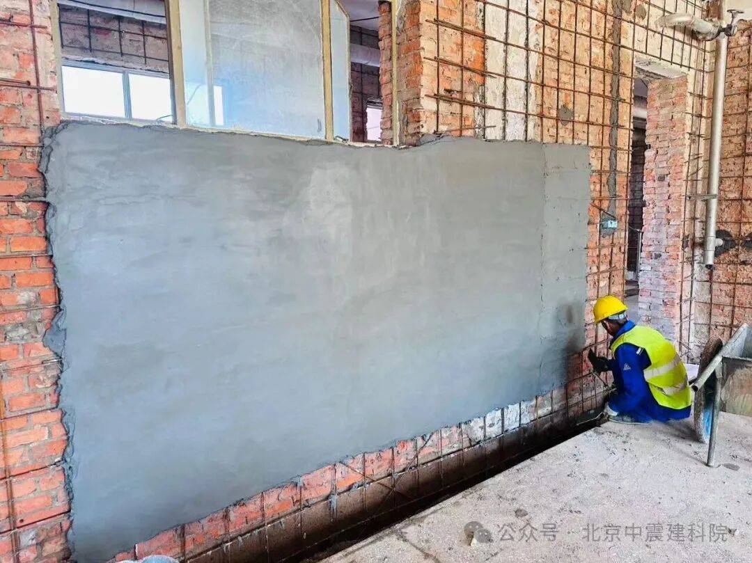 3、分层压抹施工:采用人工抹压方式,在墙体表面均匀铺设高延性混凝土,重点覆盖墙体转角、梁柱节点等薄弱部位,加固面层延伸至相交墙体端部不小于1米。